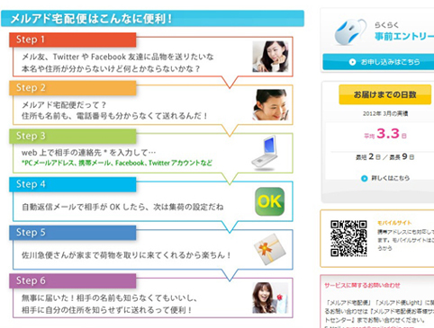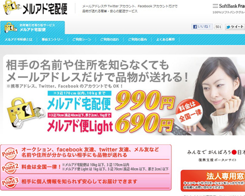 メルアド宅配便は、相手のメールアドレス又は Twitter アカウント、Facebook アカウントを知っているだけで荷物の発送・引き取りが可能なサービスです。荷物の差出人様・受取人様ともに、名前や住所・電話番号などの個人情報はメルアド宅配便が管理しますので、個人情報を保護した安全・安心の配送を実現します。